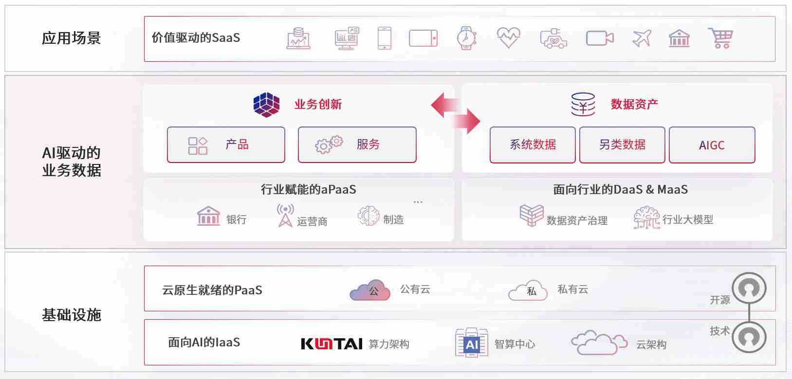 数字时代,,,围绕企业数字化转型的关键要素,,尊龙旗舰厅数码开创性的提出数云融合战略和技术体系框架,,,着力在云原生、、、、数字原生、、、AI原生和信创产业上架构产品和服务能力,,,为处在不同数字化转型阶段的快消零售、、、、汽车、、、、金融、、医疗、、政企、、教育、、运营商等行业客户提供泛在的敏捷IT能力和融合的数据驱动能力,,构建跨界融合创新的数字业务场景和新业务模式,,助力企业级客户建立面向未来的核心能力和竞争优势,,,全面推动社会的数字化、、智能化转型升级。。。