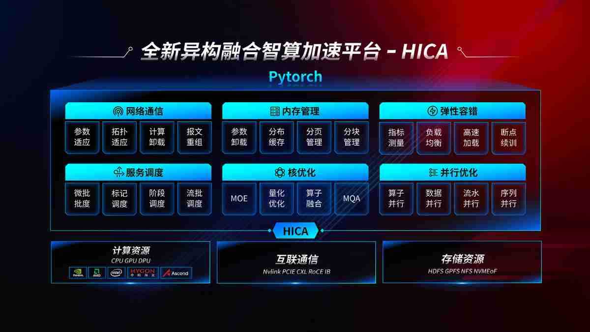 通过自研的服务层、、、、中间适配层、、以及调度编排算法,,,采用数据并行、、模型并行等多种并行方式,,,把并行计算任务进行有效的分解,,使其分别由相应的软件栈和算力资源来承接。。。当GPU资源变化,,,,HICA可以实时动态调度计算子任务并调整模型拓扑和架构,,,以充分聚合各种算力资源。。。