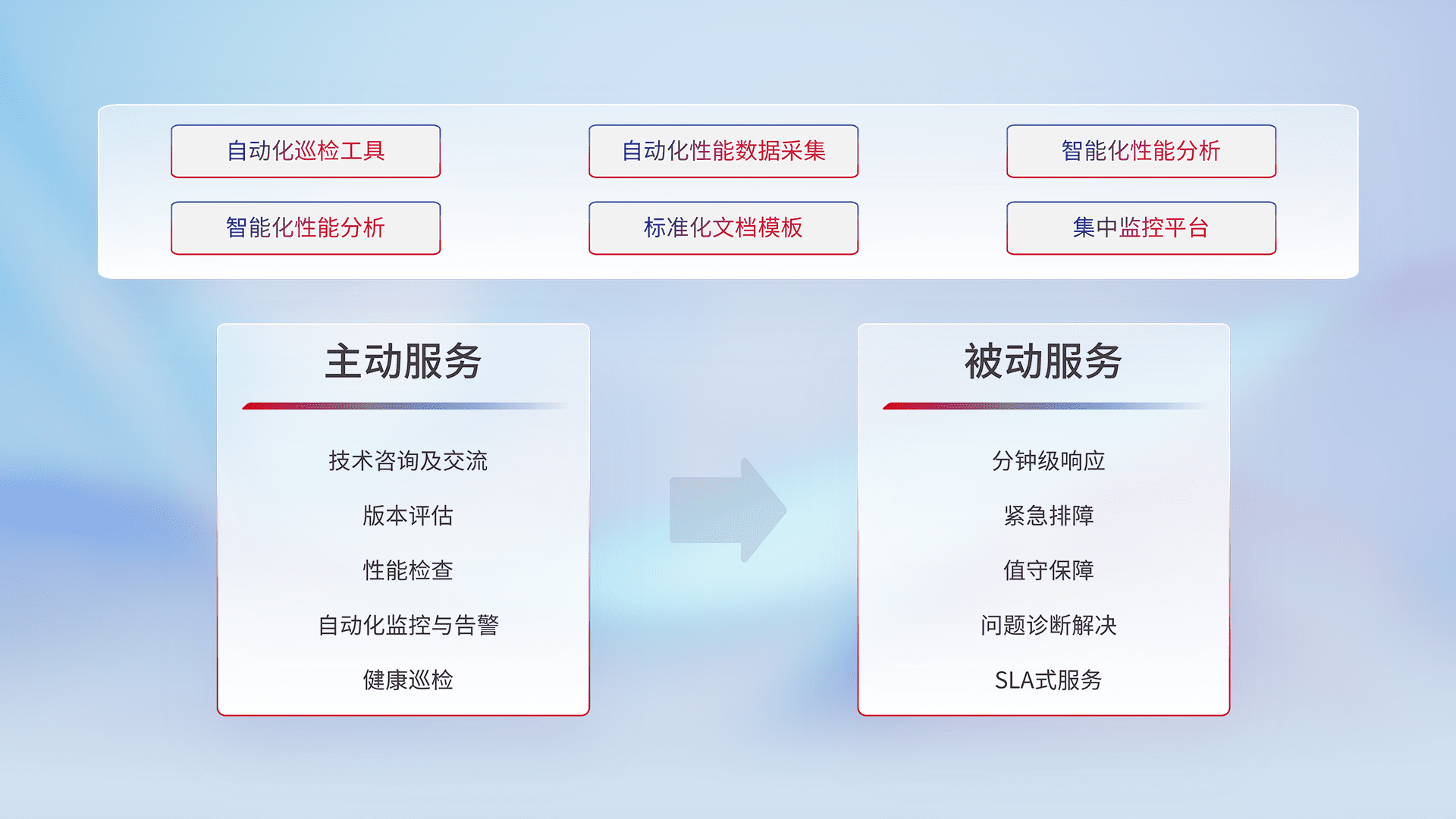 智能化工具和标准化文档,,,保障服务质量,,,,提供主动服务(包含技术咨询、、、、版本评估、、、性能检查、、、、自动化监控与告警、、、、健康巡检)和被动服务包含(分钟级响应、、、紧急排障、、、、值守保障、、、、问题诊断解决、、、SLA服务)。。