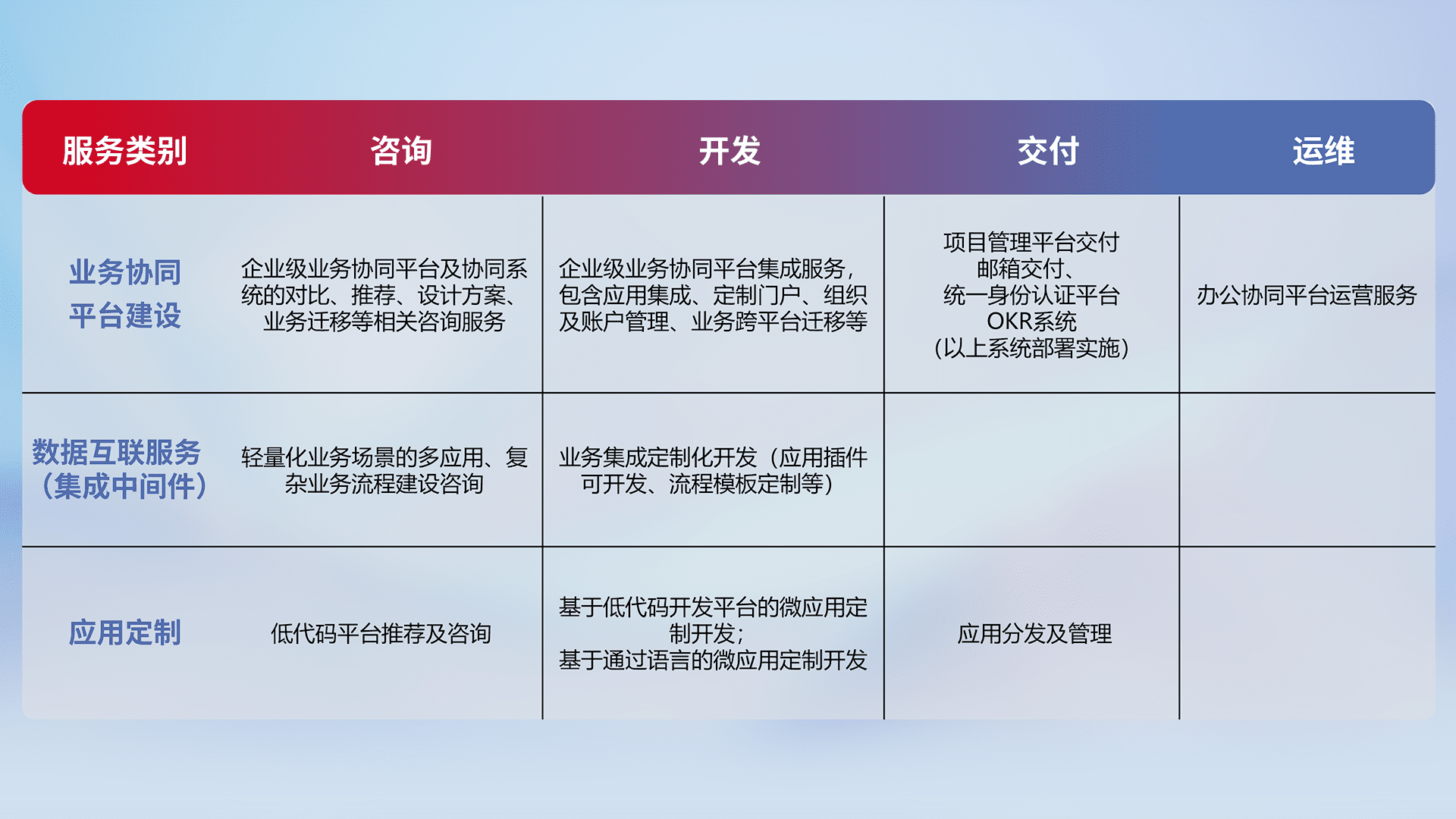 针对钉钉、、企微、、IDaas等平台级产品提供产品的规划、、、、方案、、、、交付、、、定制化开发等服务,,实现如统一协同办公、、智能客户服务、、、、混合会议管理、、智能数据查询、、、、等业务场景,,,实现数字化转型。。